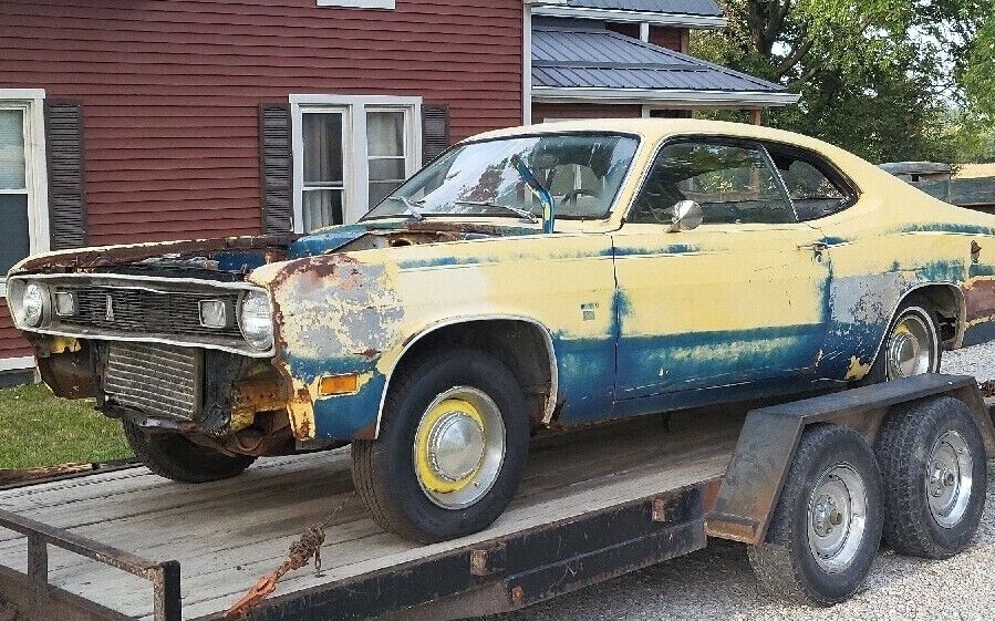 I keep staring at the outside and pondering how the finish got into the combination of hues we’re seeing here, and one explanation that seems plausible is the seller thinking the Duster went through a flood sometime after it was parked. We don’t get any specifics here such as how long ago this one was taken off the road, but he does mention the car came from Arizona, for what it’s worth, and that the body is mostly solid. But it also got hit in the front at some point, and though the radiator support survived the grille, bumper, and hood were not salvageable.