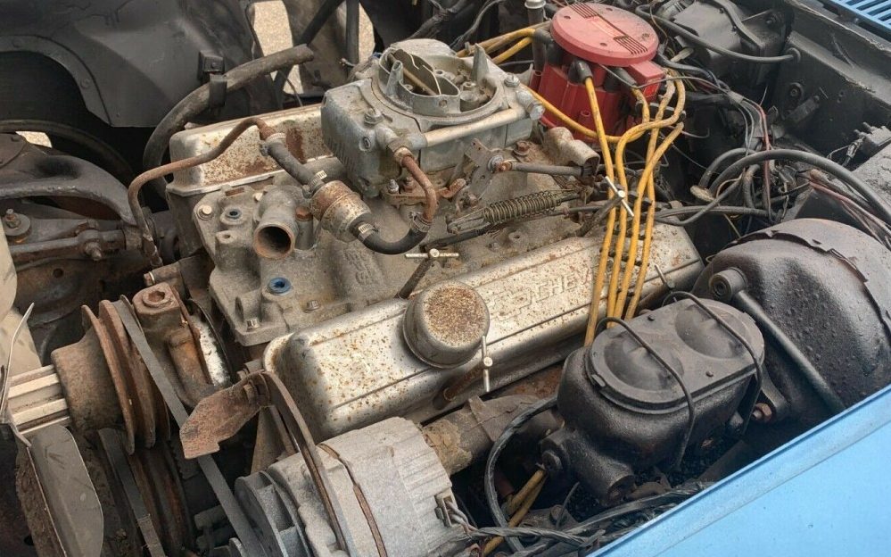 The VIN checks out in this case and power is provided by a 200 net HP, 350 CI V8, engine. It has been modified with an aftermarket carburetor, aluminum intake manifold, solid-state distributor, chrome-plated valve covers, and an aluminum bladed fan. The radiator is missing, as are the cooling hoses; this engine appears to have been dormant for a long stretch. The seller states that the engine “turns manually ” so at least it’s not seized. The transmission should be a Turbo-Hydramatic 400, three-speed automatic. It looks as if there is some missing componentry on the passenger side of the engine compartment but that could be the result of removed A/C bits such as the evaporator core – it’s hard to say with certainty as it’s a bit of a mess.