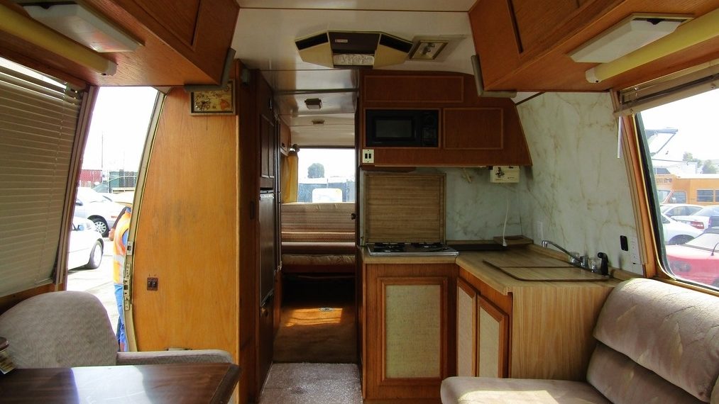Check out the interior: although this motorhome isn’t specified as a donation vehicle by the seller, most anything they take in is given away, so to see a Royale with an interior you wouldn’t moving into sitting on what amounts to a glorified impound lot is a shock. The wood paneling looks quite nice and I see no obvious evidence of water damage. Couch and easy chair fabrics although look unscathed, but I did note the window placement along the sides is different from the 1978 model we featured a few weeks ago. Personally, I like the other design better, as it allows more daylight into the common areas towards the middle of the R/V.