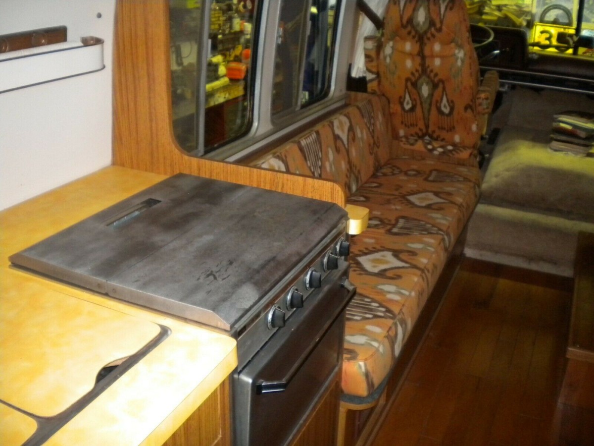 The interior is in excellent condition, far better than you’d expect for an unrestored cabin. Whenever I see a vintage motorhome with an interior that features the original cushions, pillows, dining surfaces, and driver compartment furnishings all in excellent condition, it leaves me feeling quite confident that the previous owner truly loved their home on wheels. The number of completely trashed motorhomes that show up for sale is stunning, and conversely, it’s amazing how much more valuable they become when someone simply takes care of it and stores it correctly when not in use. The Argosy has always been garage stored and it’s completely obvious based on the photos.
