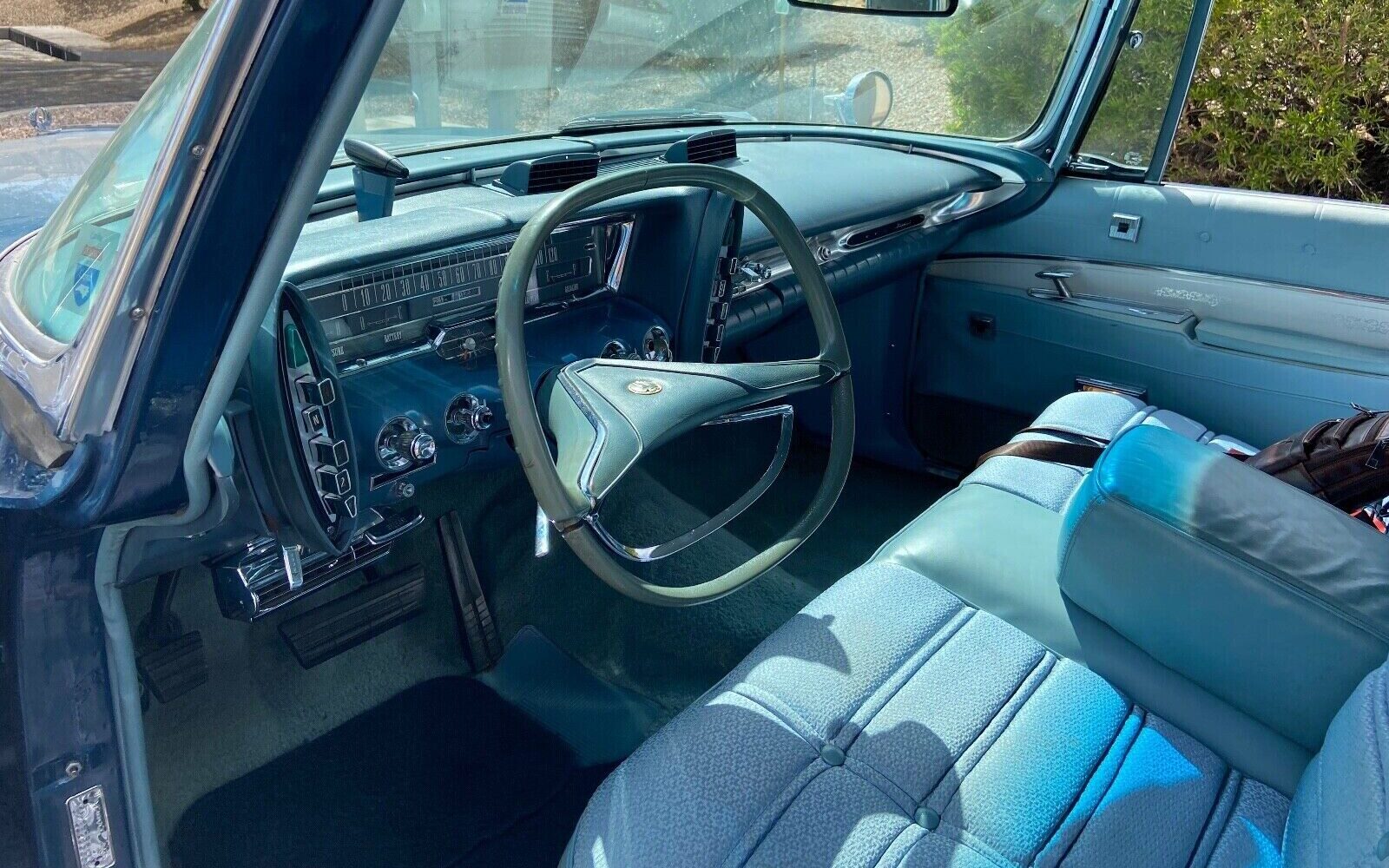The interior is a real work of art – it’s hard to fathom that it’s 60 years young and has experienced 122K miles of use. I think the most remarkable aspect of it is how clean it appears. That steering tiller is way out there and is certainly a memorable piece. While the power seats, windows, mirrors, and lights are all operative, the AM radio is on the fritz as is the A/C – the parts are all there, however.