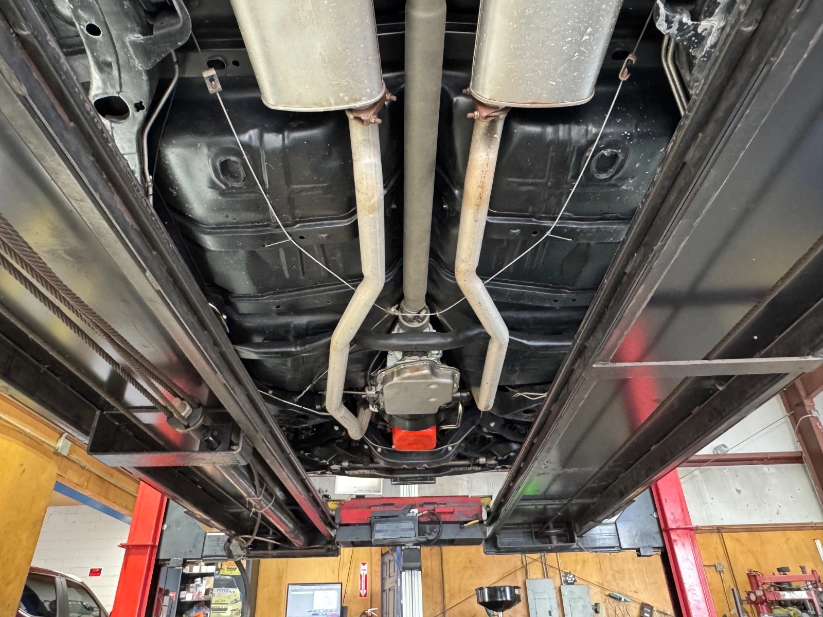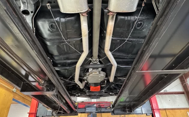 The undercarriage is rust-free, and you can see the SS454’s standard dual exhaust and Turbo Hydra-matic 400 transmission.