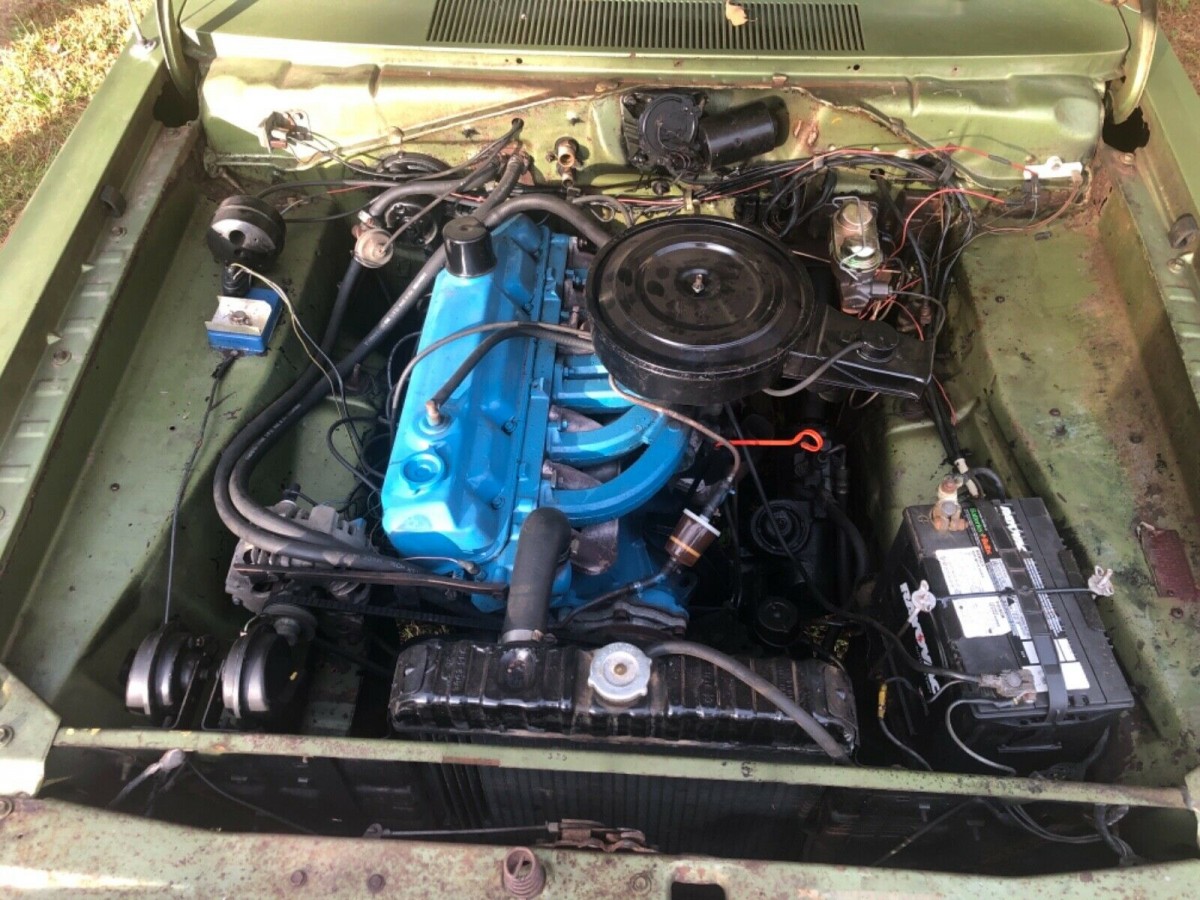 The paint has loads of patina – if that’s your thing – and there are rust and dents to be found in both rear quarter panels, so they should be replaced. The seller has already put a patch on the floors on the driver’s side of the car and he’s coated the entire area with rust-resistant paint. The roof may have once carried a vinyl top, and if so it would have been removed and painted white instead. Although the back seat looks good, the seller confirms the rest of the interior is rough and will need attention unless you’re good with pullover seat covers and faded carpeting.
