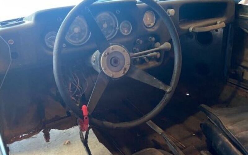 The interior’s condition pretty well matches that of the exterior. The seats are present and seem to be in fair condition though the collection of dust hides their true condition. A lot of the interior trim and upholstery components/panels are missing. The gauges, and switchgear, however still show in place. And of course, there’s that little matter of the driver’s side floor…The seller claims, “Sometime in the past the driver’s floor has been cut out, not rusted out“. I’d say it’s likely that it was cut out because it was rusted out but that’s just speculation.