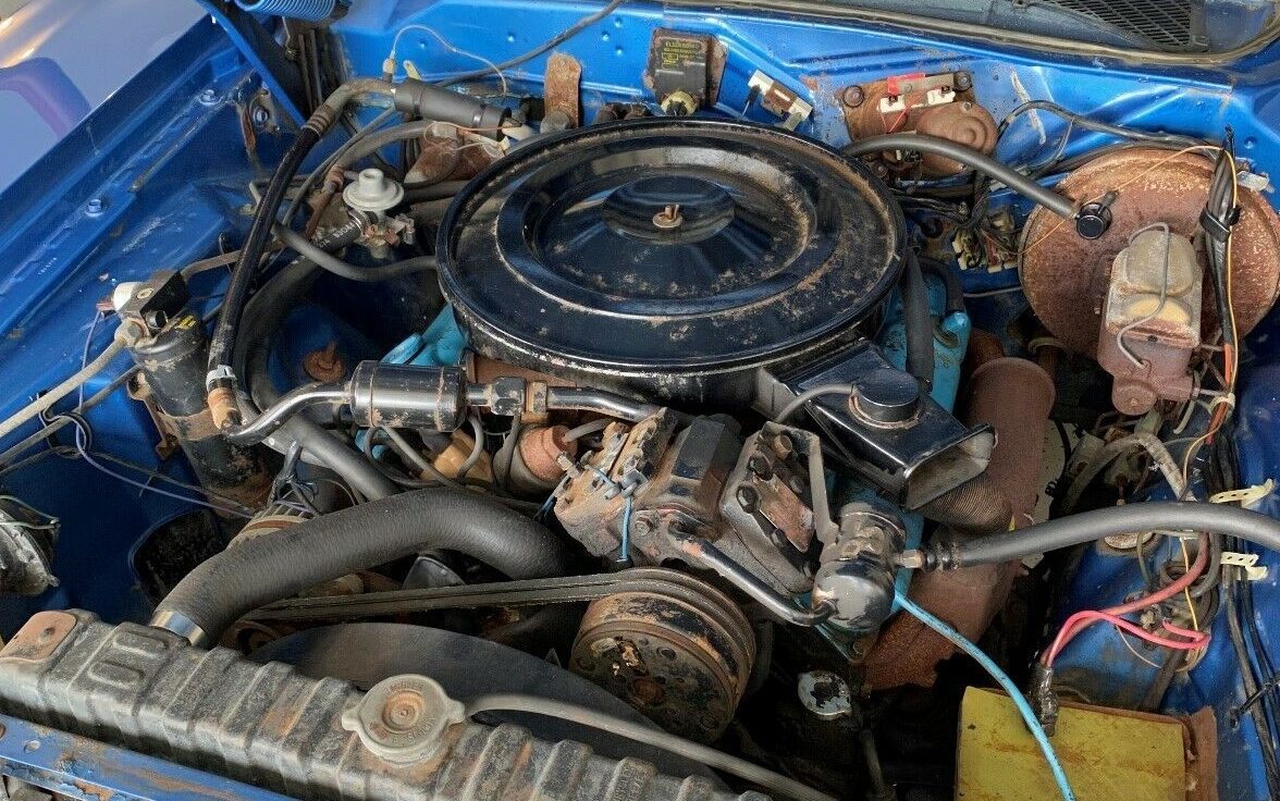 Inside continues the trend, nothing would appear to need sorting out. The seller states, “The all original blue interior could be perfect with time spent.” It really doesn’t look like it needs any attention. True, the dash pad is split but the upholstery and carpet show no signs of stress or wear; perhaps just a good cleaning is all that is needed. Nice to find is the original radio, it, fortunately, wasn’t replaced by a Kraco AM/FM cassette player somewhere in its past. This is an A/C equipped car but there is no mention of its operational capability.