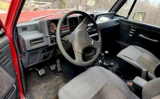 The photos are a mixed bag of small and large images, so my apologies that some of them are a bit pixelated as they’re stretched to fit the format here. The seller has done a great job of providing photos of almost every area of this cool little 4×4, other than the rear cargo area. The body of this Mitsubishi-based captive import Dodge, from the era when Dodge and Mitsubishi offered some very interesting vehicles together, looks great, and the seller says there is no rust other than some surface rust. Headlight washers are a nice feature for off-roading.