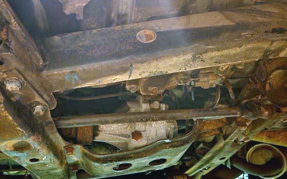 Karl, I believe those areas are oil on the frame, not rust holes? I could be wrong, but they look like oil to me. Although now that I look at them closer, one looks like an oil stain, and the others look more jagged like rust. Hmm…