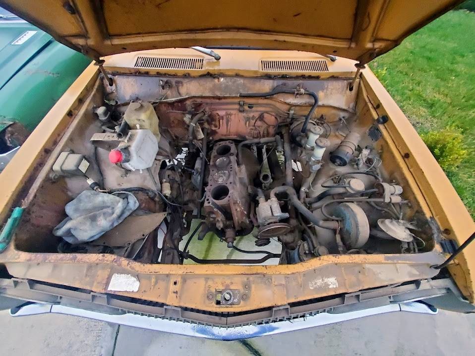 At first, I thought this one was a junkyard find, sitting with the interior still covered in the remains of another vehicle from the yard. However, it’s pretty clear upon looking at the engine bay photo that this is the head of the Datsun’s four-cylinder mill, unceremoniously tossed on the front seat, the remnants of a project that was never completed. Now, a few things have happened: the engine has been sitting with the head removed, exposing the innards to the atmosphere which usually results in rust; and two, the engine parts removed and tossed inside the truck have likely dug into the front seats, leaving an indentation that will take some time to remove. Hopefully, oil hasn’t leaked onto the fabric as well, but it should be a pretty durable vinyl underneath there. Surprisingly, the dash doesn’t appear to be cracked.