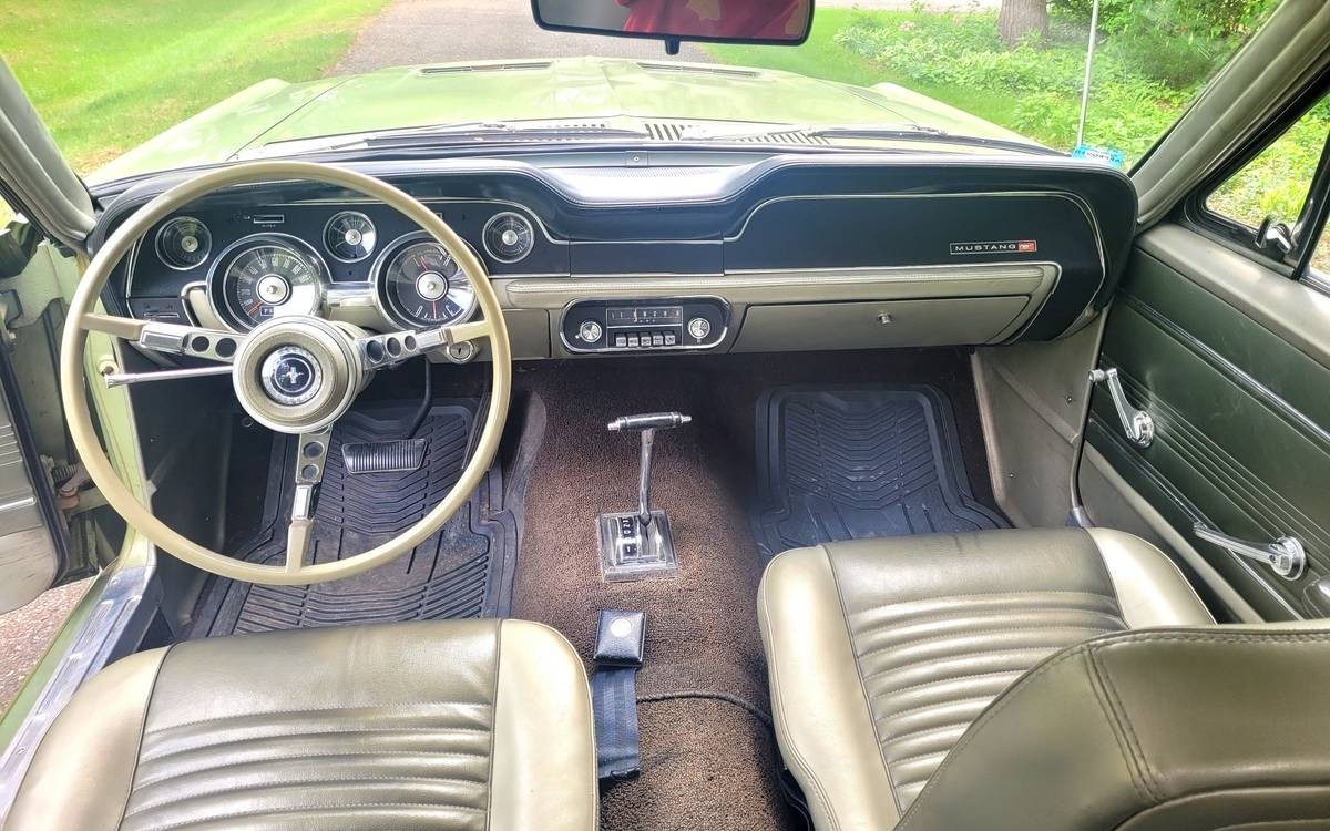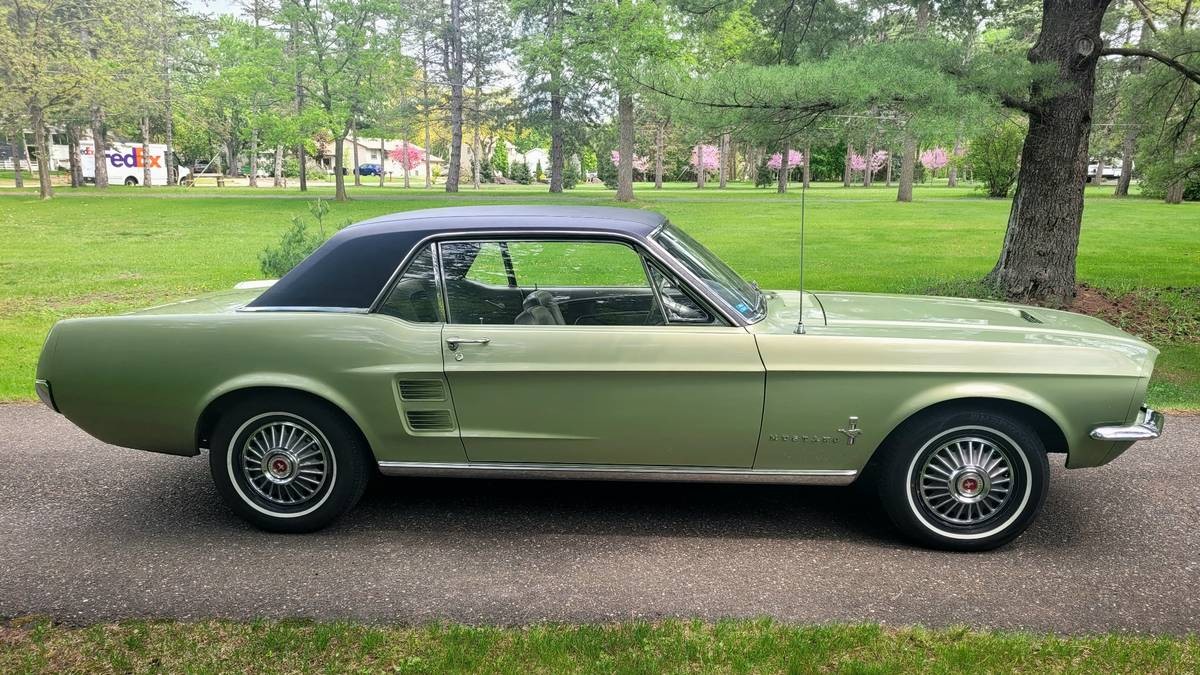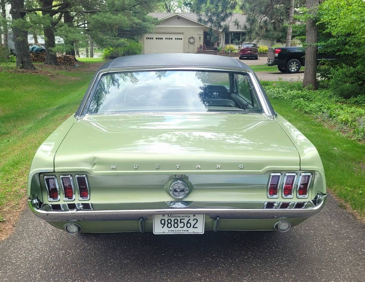 My high school car was a 1967 Mustang this same color, vinyl top, but black interior. Mine was powered with a 390 with three speed transmission. On rainy days I would start to drive in second gear because the engine had so much torque the rear tires would spin. Paid a whole $600 dollars for it way back then. 3 on the floor, no power steering or brakes, a foot pump to spray water on the windshield, and an AM radio. Man I loved that car.