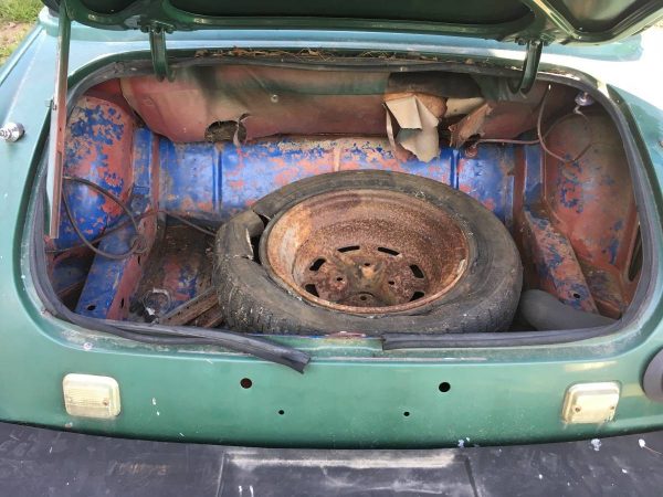 The trunk shows fairly solid at first glance. However, when the picture is enlarged, it appears that there is stagnant water lying on either side of the wheel wells. The condition of the rear trunk liner also exhibits the telltale sign of water damage, it is a real possibility that this car has been sitting outside uncovered or without a top for some time. The underside of the vehicle is a complete mystery and no mention of its condition is mentioned. Unfortunately the way these rust, it is imperative to take a good look to be sure the frame is usable, and that the floorboards are even there anymore. While there are no interior shots of the car, what can be seen on the profile pictures, is that the seats are missing and again, no mention of them are provided.
