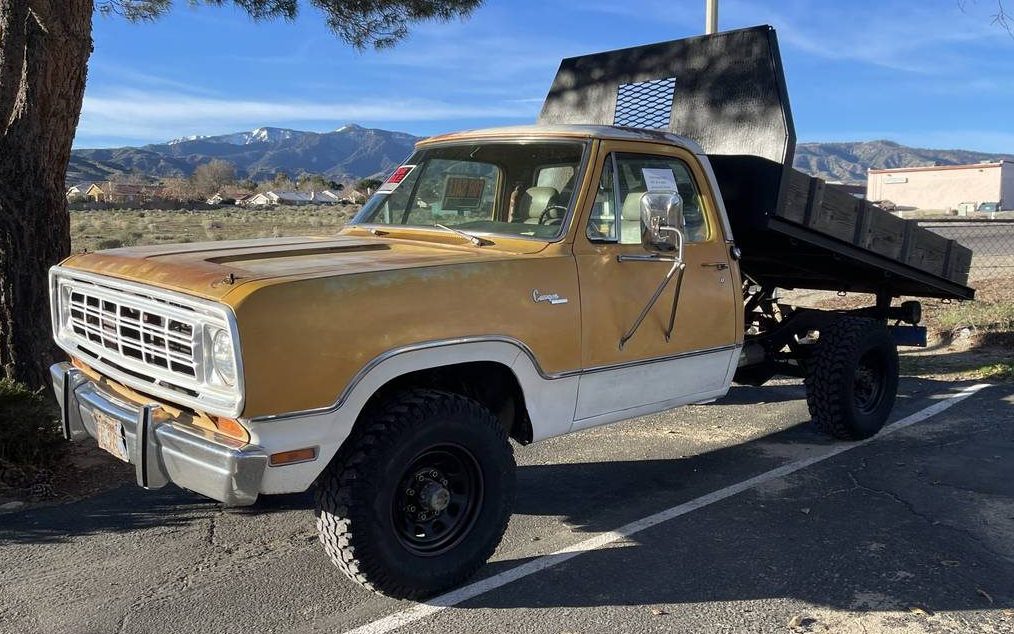 Blame the Eagles, but I see the makings of a country rock song any time I see a flatbed truck from the 1970s, and the image of this 1974 Dodge W200 (it’s advertised as a D200) in the face of a rising (or setting) sun is certainly romantic enough to be the subject of its own tune. It’s a cheap muse, too, with an asking price of $5,400. Barn Finder Rocco B. found it on craigslist in Phelan, California, where smog testing doesn’t apply to 1974 models, so you can “Take It Easy” and not worry about that.