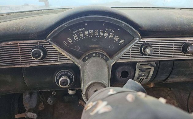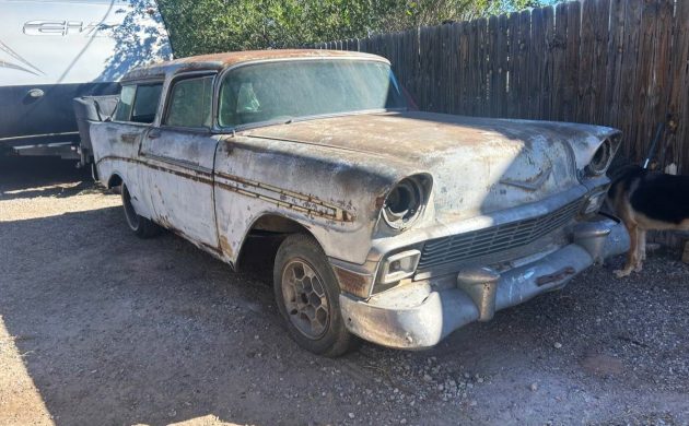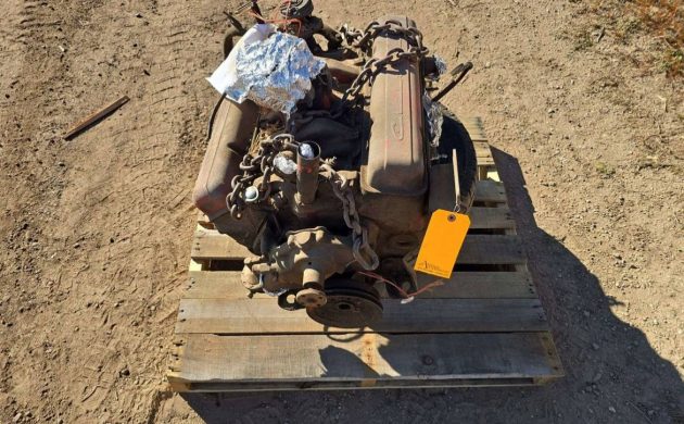 The seller’s 1956 Nomad was once quite the looker, finished in two-tone black-yellow paint. From the column shift-pattern, it had/has a 2-speed Powerglide automatic. A 283 cubic inch V8 (out of the car) is part of the package, but I don’t believe that motor was available before 1957, so this vehicle is likely not numbers-matching. We’re told the underpinnings of this Chevy are solid, which makes the restoration more plausible. Some, but not all, of the chrome bits are still around.