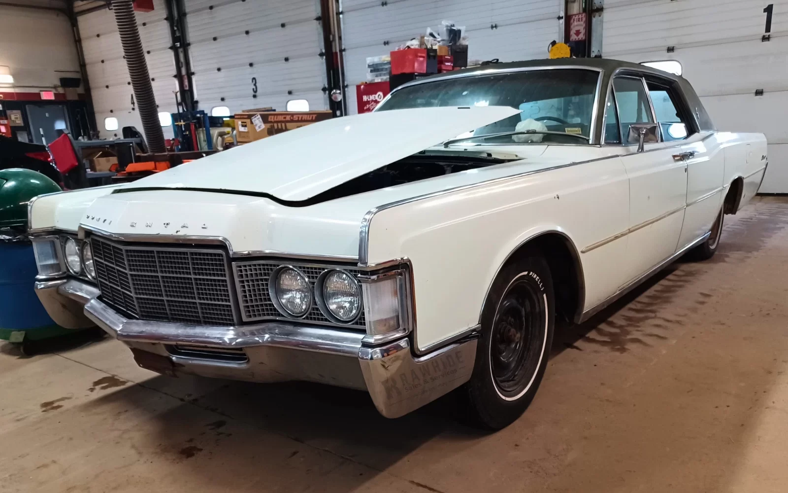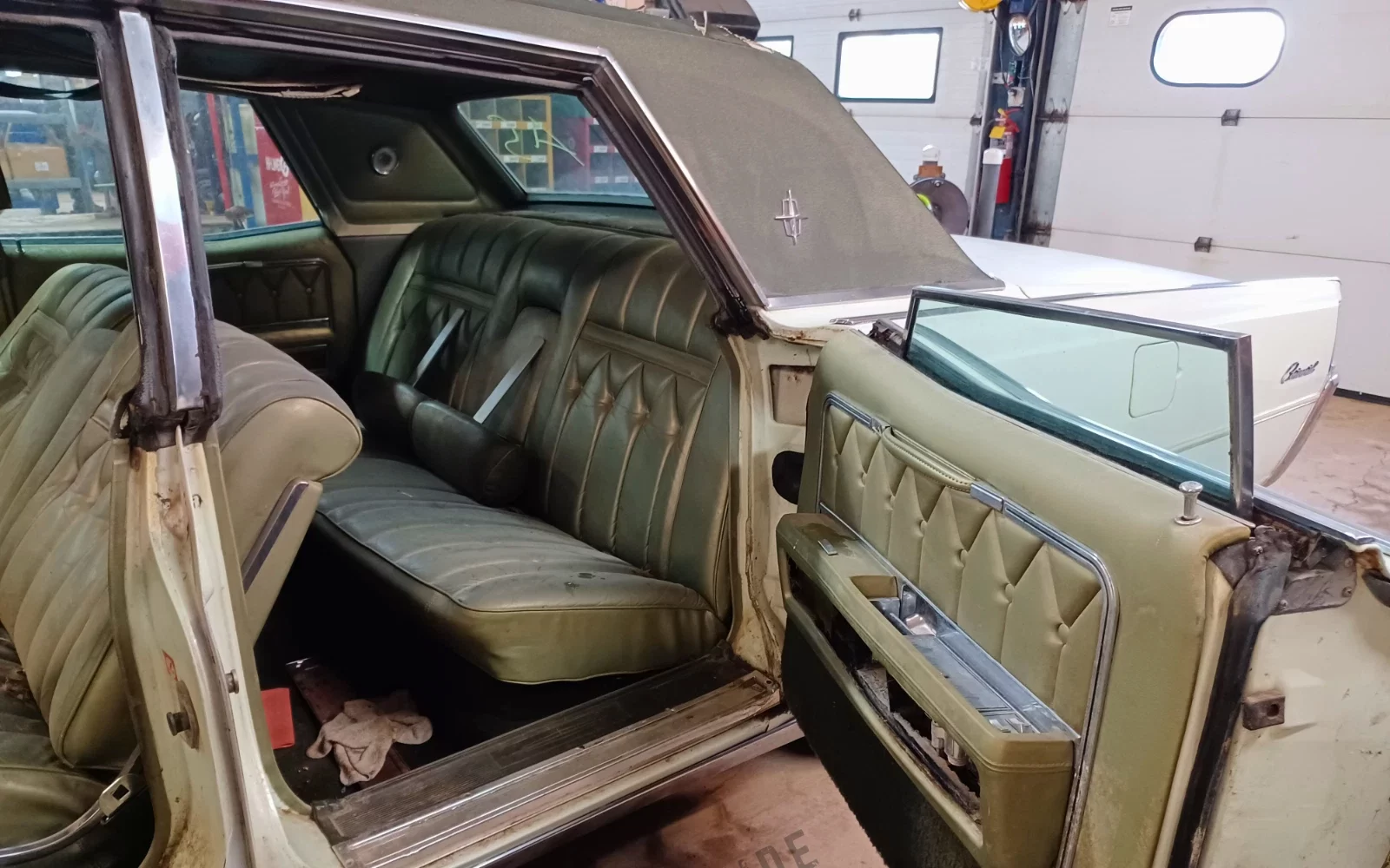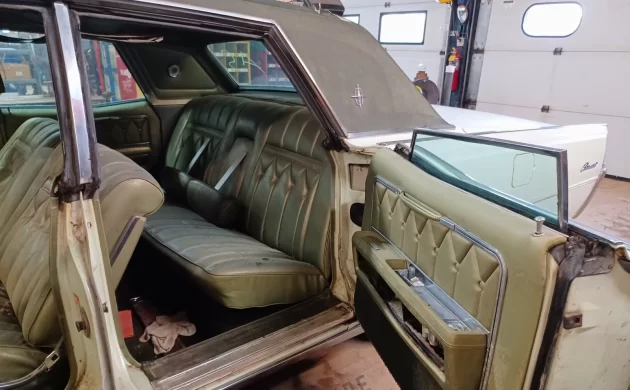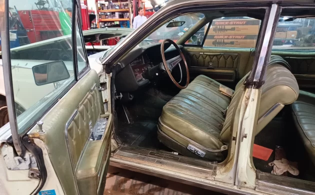 The exterior appears to be basic white, but the interior is a shade of green that you’d only find in the 1960s and 1970s. I love it. The front seat certainly appears to be leaning at a rakish angle, which means that it isn’t properly bolted down. We can see from here that the Lincoln has power windows and a power seat, so it will be “fun” (cough cough) to get those features in operating condition again. As far as old cars are concerned, luxury cars can be the most frustrating.