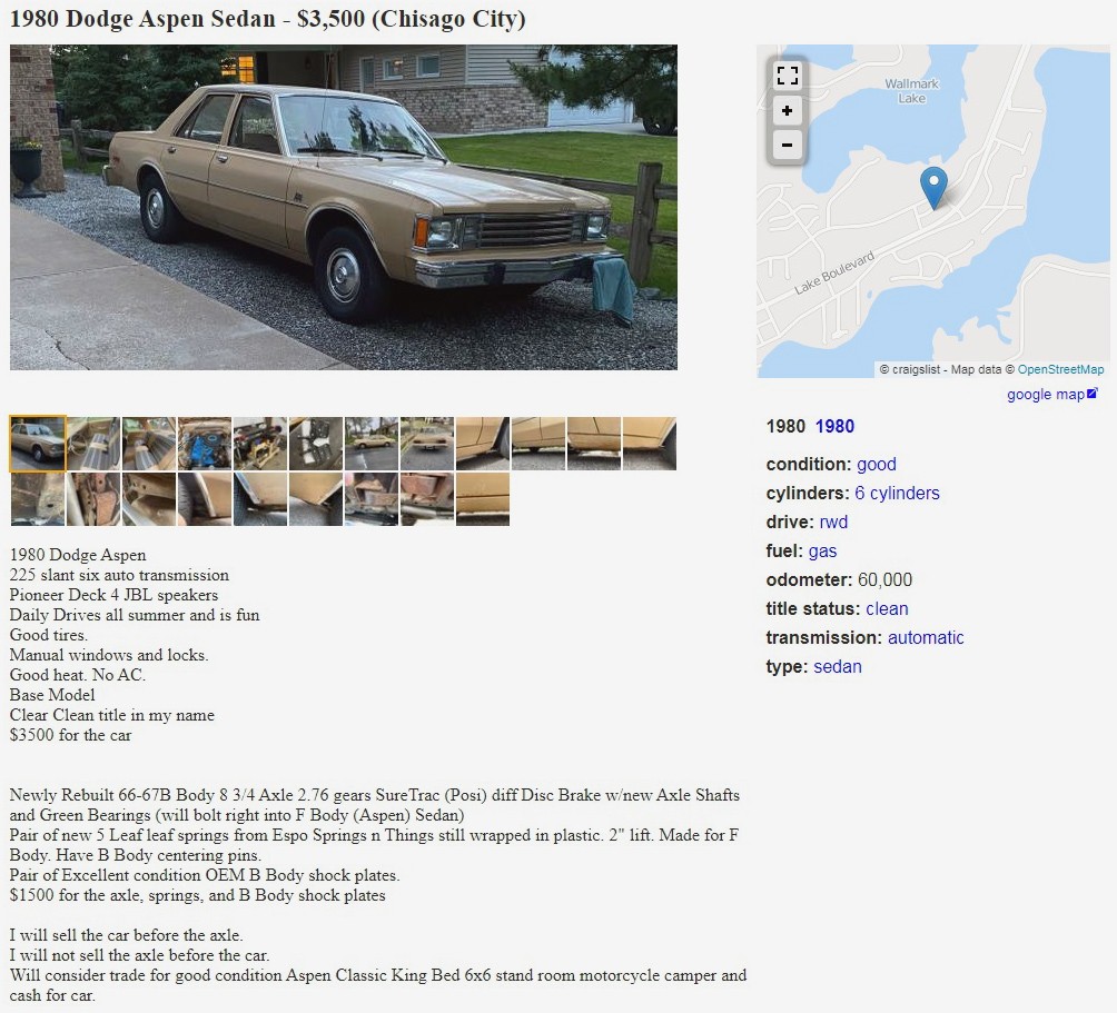 Made for only five years, which is hard to believe – 1976 through 1980 – the Aspen and Volare started off a little rough with some quality issues, but by the time 1980 rolled around, they were pretty good cars. This one has an incredibly clean 225-cu.in. slant-six, which had 90 horsepower and 160 lb-ft of torque when new. It looks like it has power steering, unless I’m seeing things, but no power brakes? It’s backed by a three-speed TorqueFlite, and the seller says it’s a good daily driver, and I believe it. They also have a list of new and rebuilt parts, including a sweet, rebuilt entire rear differential for $1,500 extra, should a person have a need for that. Please check out the listing to see the photos of that and their description. Any thoughts on this super cheap Aspen?