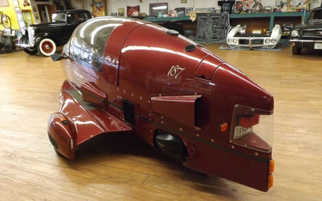 The ingenuity of mankind attempting to get from here to there has spawned occasionally astonishing solutions. Here on eBay is a 1986 Pulse Autocycle, with spirited bidding to $17,895. The Pulse is located in Galion, Ohio, and it’s largely roadworthy. The engineer responsible for creating the Pulse was James Bede who formed the Tomorrow Corporation with Stan Leitner to produce what he called the Litestar from plans for a similar contraption that Bede called the BD200 (mostly sold in kit form). The manufacturer was – eventually – Owosso Motor Car Company after a prior maker couldn’t scale up. This web of inventor/co-conspirator/contractor/producer is typical of small-batch car-making. Sometimes it’s hard to tell who did what. Anyway, about 326 of these were made. The frame is tubular steel and the body is fiberglass with in-line seating for two. A motorcycle engine was fitted from the factory, usually a Yamaha 400.