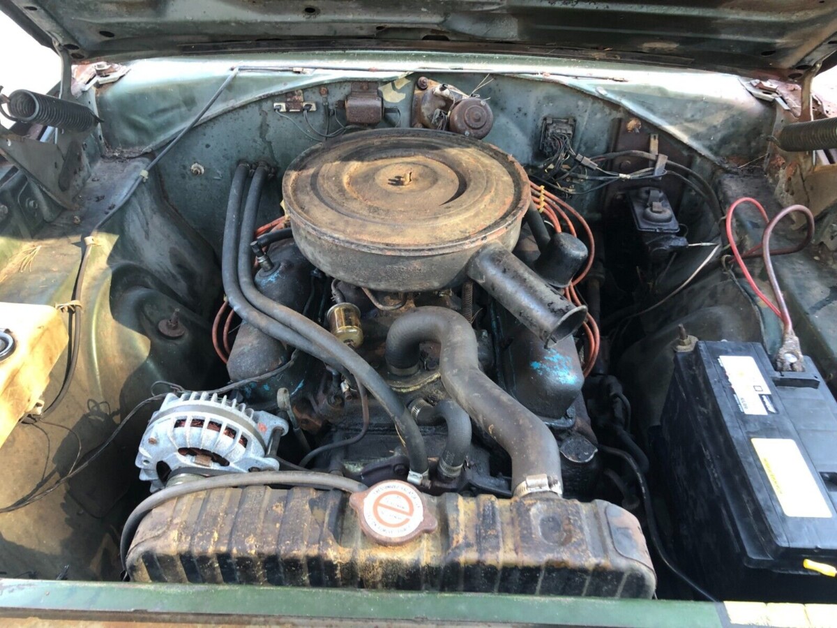 Rust is something of a problem with this Plymouth, such as with the fenders and lower quarter panels and the driver’s side rear frame rail has a couple of holes. The trunk is solid and we’re guessing there’s no reason to be concerned about the floors. Though well worn, the paint could be original, which was a popular color, Ivy Green Metallic. The convertible top could be passable except for the rear window, which is long gone. But the power mechanism still works, which is a plus. You’re going to have to redo the front beach seat anyway, so you might as well recover the rear while you’re at it.