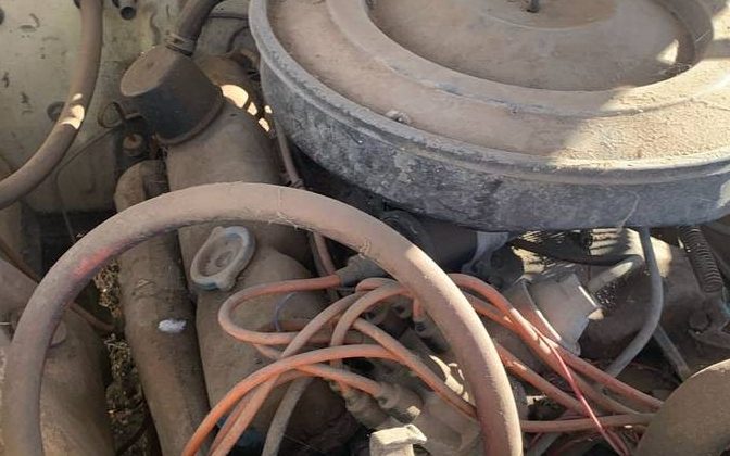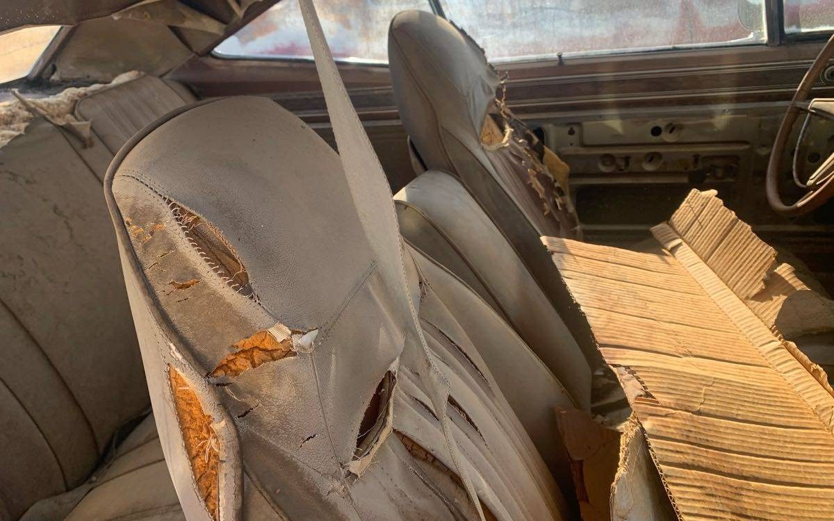 The interior upholstery selection appears to be corrugated cardboard – well, maybe not originally. There is a split-bench seat under all of that brown paper but it is sun-shredded to bits. The headliner looks to have given it up as and the driver’s side door panel is among the missing. The upholstery’s condition is in keeping with what one would expect to find on a car long domiciled in the hot, bright southwestern sun.