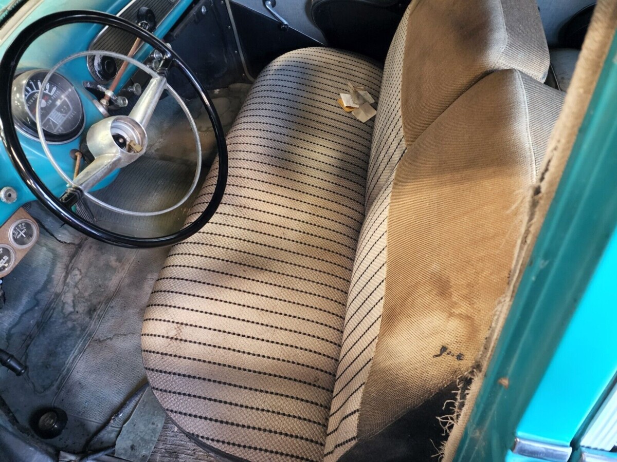 The wagon’s interior needs a thorough cleaning and repairs here and there. The windlace is torn, and the fabrics are stained. The horn button is missing. Aftermarket oil pressure and ammeter gauges have been added under the dash. The headliner and back seats have seen better days. The gear change is barely visible here, coming out of the dash binnacle.