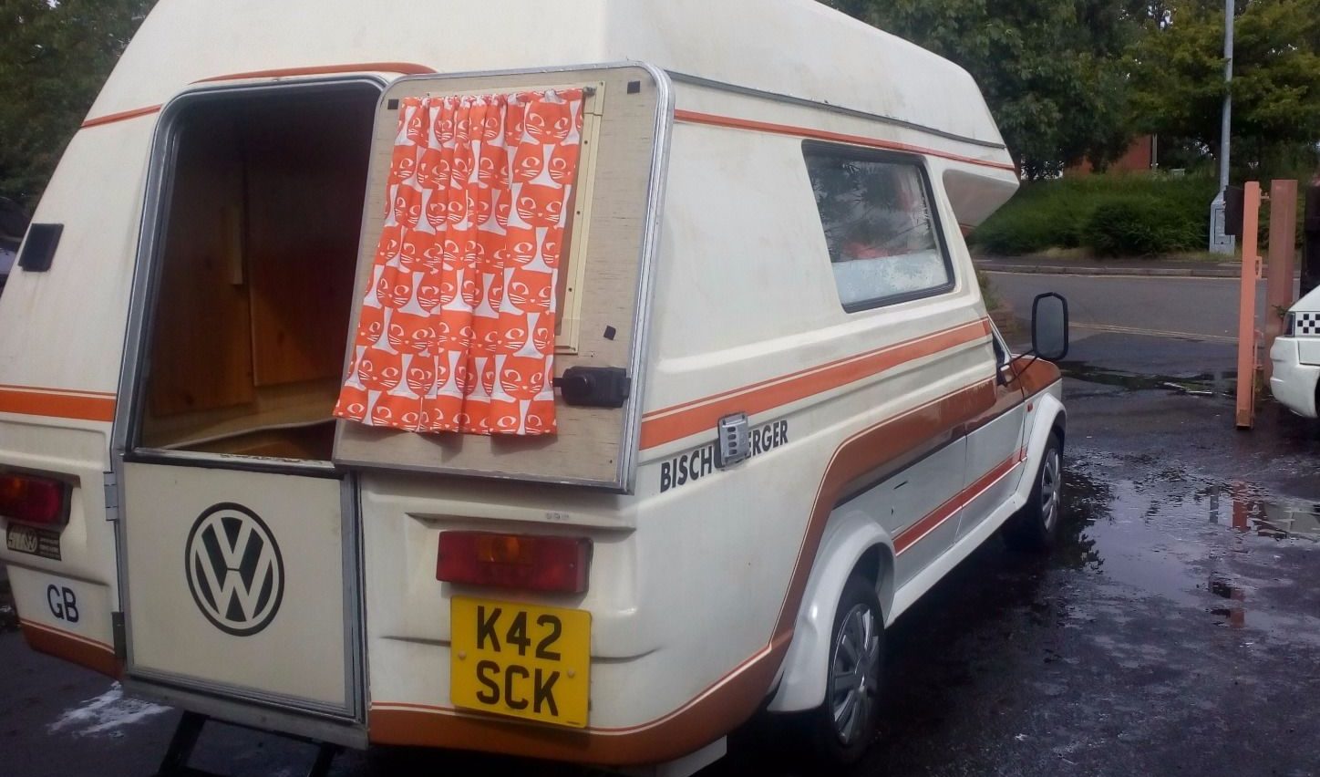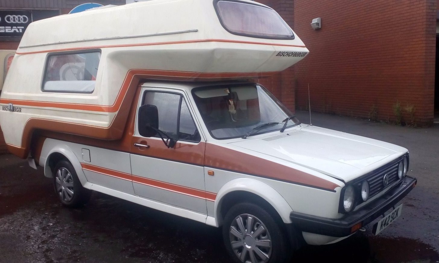 The seller is clearly a VW / Audi dealer and/or mechanic, so I’d feel comfortable lodging a bid from afar. The large VW sticker out back likely didn’t come standard, but the stripe kit and “Bishcofberger” nomenclature certainly did. From this angle, you can appreciate the fact that this narrow VW pickup body didn’t add on too much extra girth with the camper attachment, seemingly barely any wider than the plastic fender flares over the wheels. Not that it matters in the US, but the camper does have a valid 12 month MOT.