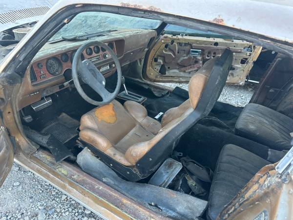 The interior of this Formula 400 is rough like the exterior. The seller has a Corvette seat sitting in the interior but it does not look like it is bolted in. The dash is cracked and the door panels are missing. Replacing the interior with aftermarket reproduction will cost a pretty penny. I just replaced the interior of my 1973 Trans Am I am restoring and the cost was about $5,000. The seller says that the engine turns over but as you can see, this one is going to need some work to get it to driver status and much more work to restore it to factory.
