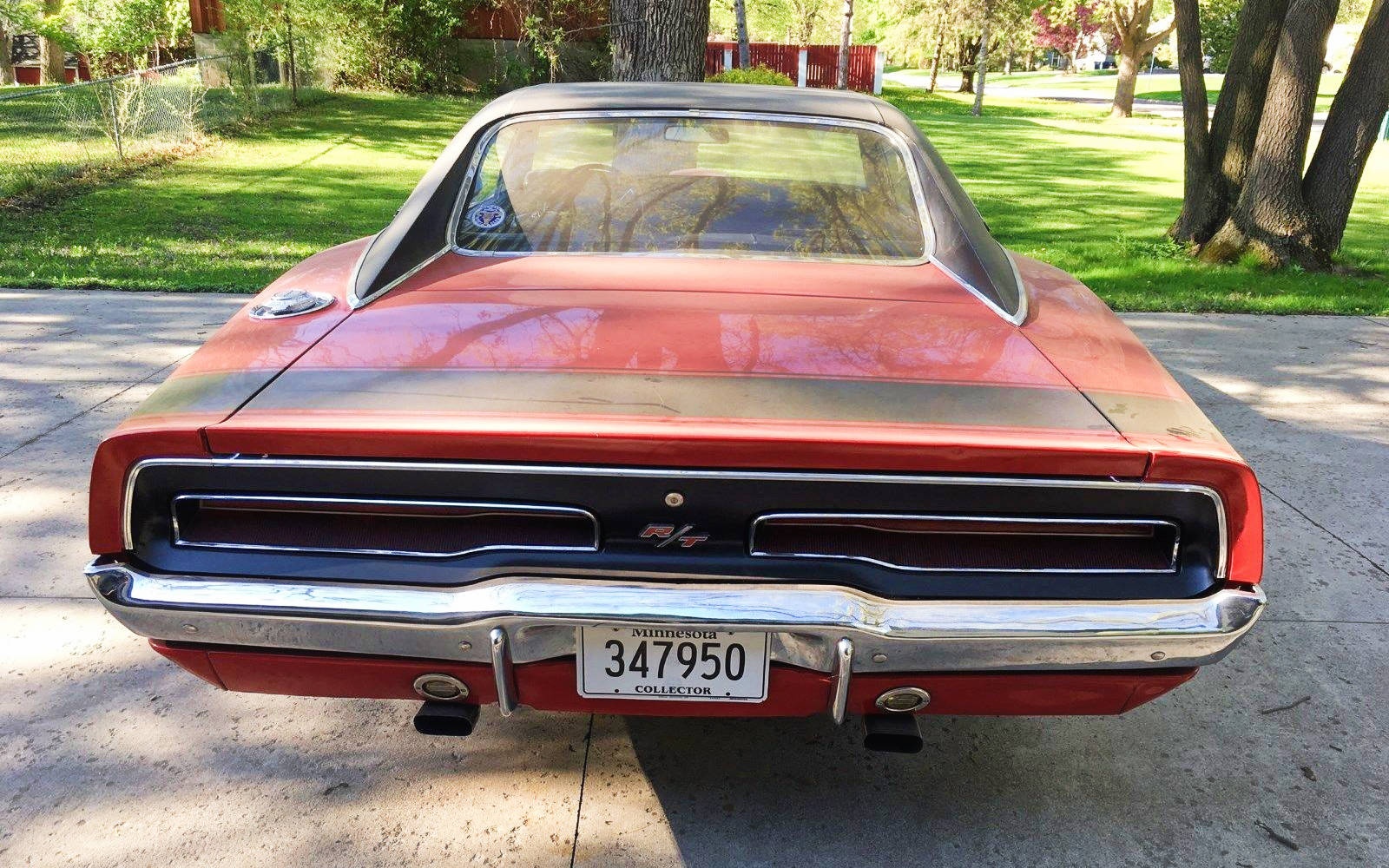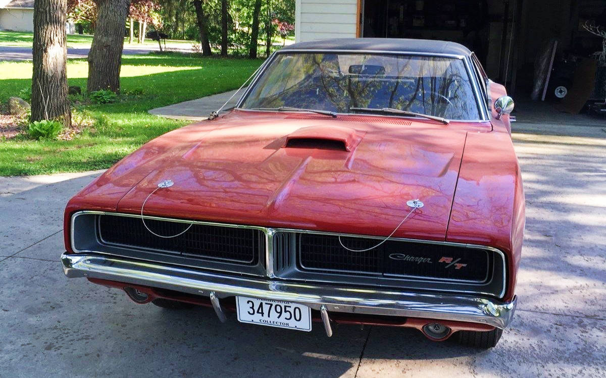 I remember a car very similar to this one being offered by RK Motors in Charlotte a while back. It’s a high-end musclecar and hot rod dealer. They had a ’69 Charger RT Hemi with Mr. Norm’s heritage, red with black stripes and vinyl top, and the dog dish hubcaps. From what I recall, the scoop was installed at the dealer.