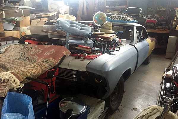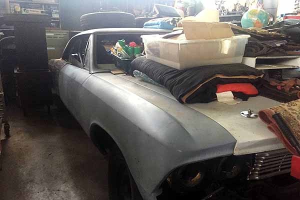 Remove the junk and let’s see what this problem child really looks like. Looks like a set of BBC headers in the back of the car, hard to tell with so much junk, scattered parts everywhere. Like the ’66 Chevelle’s in general, too bad no one ever finished this project racer, been like this for years probably.