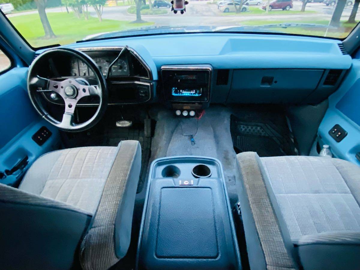 What I mean by that is it’s possible the seller is looking to score some quick points with potential buyers with easy dress-up bits like the brush guard, wheels, and taillights. The good news is the parts that are must-haves among Bronco enthusiasts all seem to be accounted for, like a minty blue cloth interior featuring factory bucket seats, full console, and cold air conditioning. Again, the aftermarket steering wheel is another example of cheap dress-up points, but you can easily swap that out. The interior does have some rough spots that I’m curious appear worse up close, such as the cheap aftermarket radio, some extra gauges with loose wiring hanging down, and some stains on the carpet.