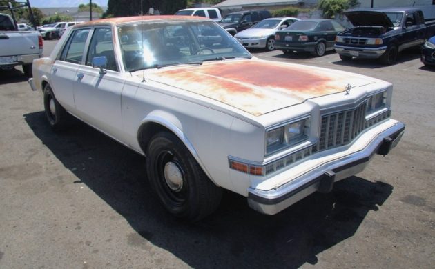 These were common police cars (along with the Dodge Diplomat stable mate) when I was a young miscreant in the ’80s. In fact it seemed to me like very few non-police examples were on the road at the time. (Unlike the more upscale Chrysler New Yorker, which was popular with older buyers.) The headlights/parking lights made a very distinctive profile in your rearview mirror when they were riding behind you.