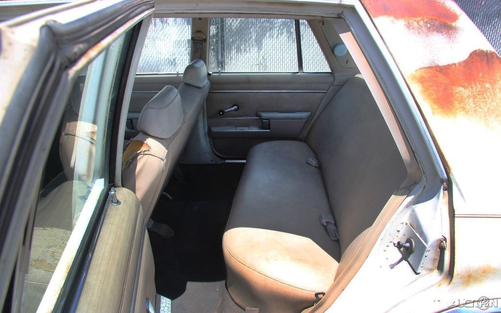 It’s got a police vibe interior, with the basic (standard) bench seat in front in cloth and vinyl, both of which have seen better days. Upholstery is a relatively easy fix, and unless I’ve missed it, the hot southern California sun hasn’t seemed to wreak havoc with the dash or anything else inside. The back seat appears to be all vinyl, so maybe this was a law enforcement car at one time?