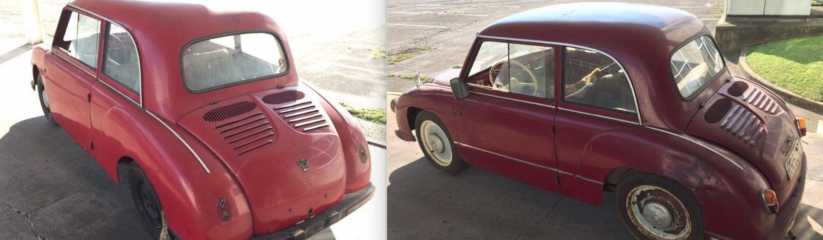 The Maico name might be familiar to some. In the 1950s Maico built those fat German motor scooters, including the huge Maico Mobil, and in the 1970s they built great enduro motorcycles. In the 1950s they also purchased the remains of Champion Automobiles and built the Maico 400 and Maico 500 from the remains of Champion. They advertised the Maico 500 as “Strong roomy and economical…that is the beautiful and elegant line of Maico 500 four-seaters”. There is much more imagination than truth in the claim, of course. The one on the left is a 1958 model and on the right is a 1959 model. They are advertised on Hemmings here and here for $5,000 each (or perhaps two for only $10,000?). They are from the Lane Motor Museum in Nashville, Tennessee. They are rust free, fairly complete and ready for restoration.