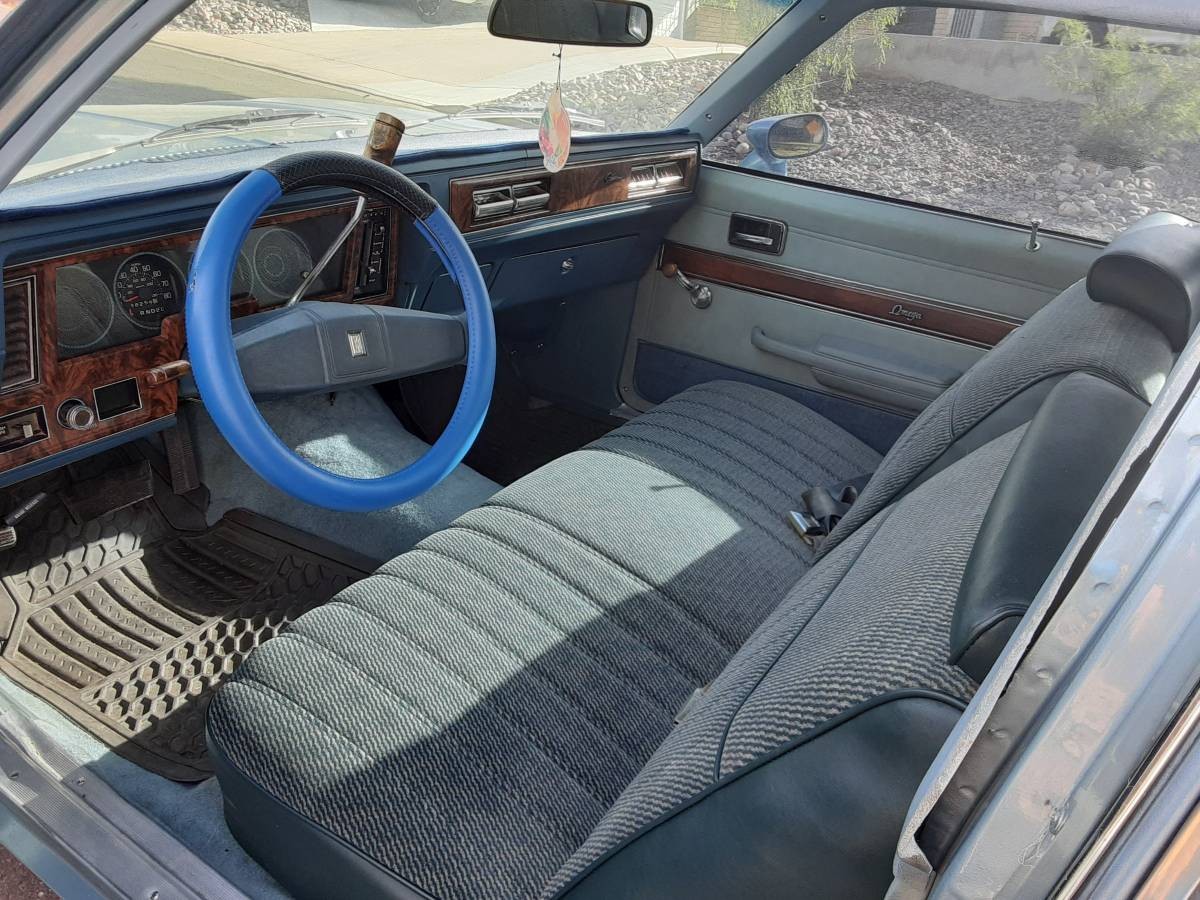 The seller’s Omega is a pretty nice car, equipped with power steering and brakes (front discs?), factory air conditioning, automatic tranny, Rally wheels, and velour upholstery (it’s been redone). It all presents quite well, although I’d have to lose the cheapie steering wheel wrap. About the only things that appear to have departed from stock is the air shocks in the back and the dark tinted glass. For a car with 88,000 miles, it looks pretty solid, though the trunk is a tad messy.
