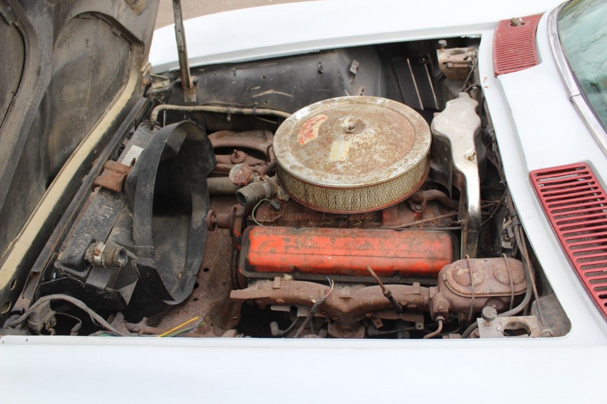 Now we get to the heart of the matter. As advertised, this is a numbers matching four-speed C2 Stingray and the seller provides a couple of nice photos of the 327 small block V8. Unfortunately, heavy rust scale is present here as well and its evident years of damp storage have not been overly kind. Does the motor turn freely? Since the seller doesn’t indicate otherwise let’s assume it does. You’ll notice the carburetor and radiator are missing but the seller claims to have them in his possession along with the expansion tank and alternator. Mileage is listed at 64,134.