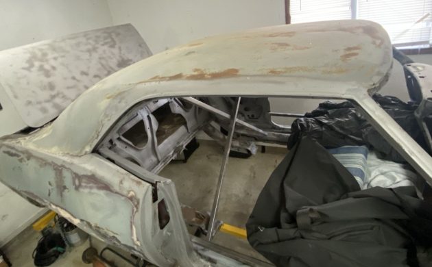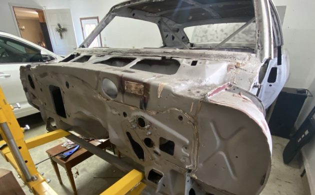 The seller has already done much of the heavy lifting, including having the body media blasted and treated with anti-corrosion inhibitor. The car remains mounted on a high-quality Jegs rotisserie with custom mounts, which is included in the sale. Interior support tubing was welded in prior to teardown to preserve the structure, and the photos show solid rockers, frame rails, and structural points, likely thanks to its Georgia origins.