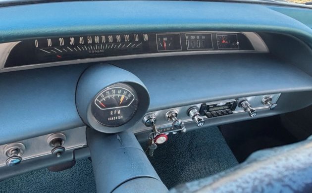 The trim tag reportedly decodes to show tinted glass, a padded dash, deluxe seat belts with retractors, rear view mirrors, the comfort and convenience package, and two-speed wipers. The car was built during the fourth week of April 1964 in Atlanta, Georgia. The radio has been upgraded with kick panel speakers, offering a subtle modernization while retaining the car’s overall period feel.