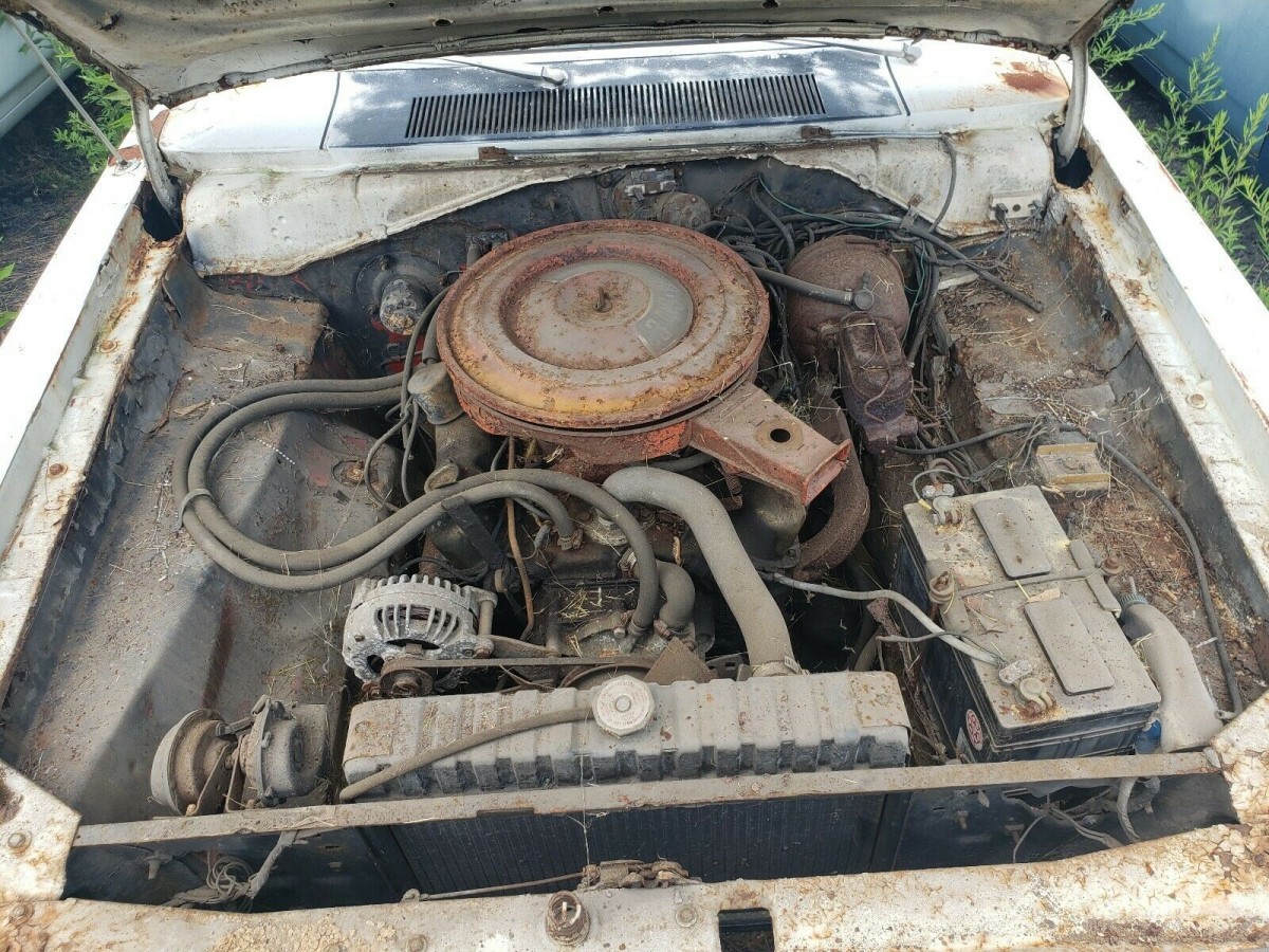 Very unusual color for any a-body Mopar of that era. Less than 5% in white for 72 I think. Must have been a striking looking car when new with the blacked out hood treatment and side stripes. Console shifter is a nice option but I’d prefer an example with the 3- or 4-speed. From the looks of the brake booster this car is also equipped with power front disc brakes.