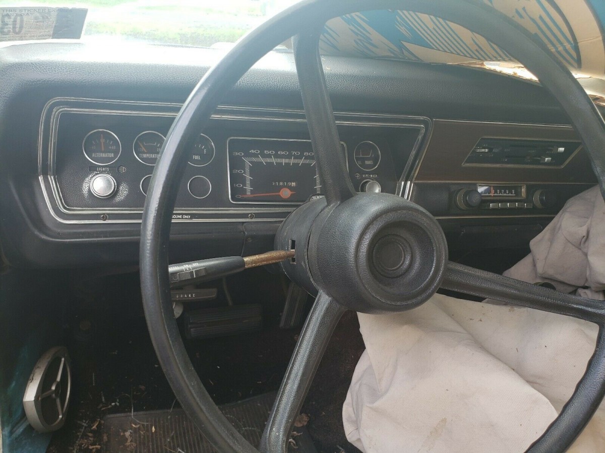 The gauges are clear, the OEM radio remains in place, the steering wheel rim isn’t cracked, and the dash pad looks surprisingly solid. The seller does note some rips in the seats but that they remain covered. The console and automatic shifter surround look decent as well. This Demon is a major project, but with a matching 340 under the hood, it seems worthy of rescuing.