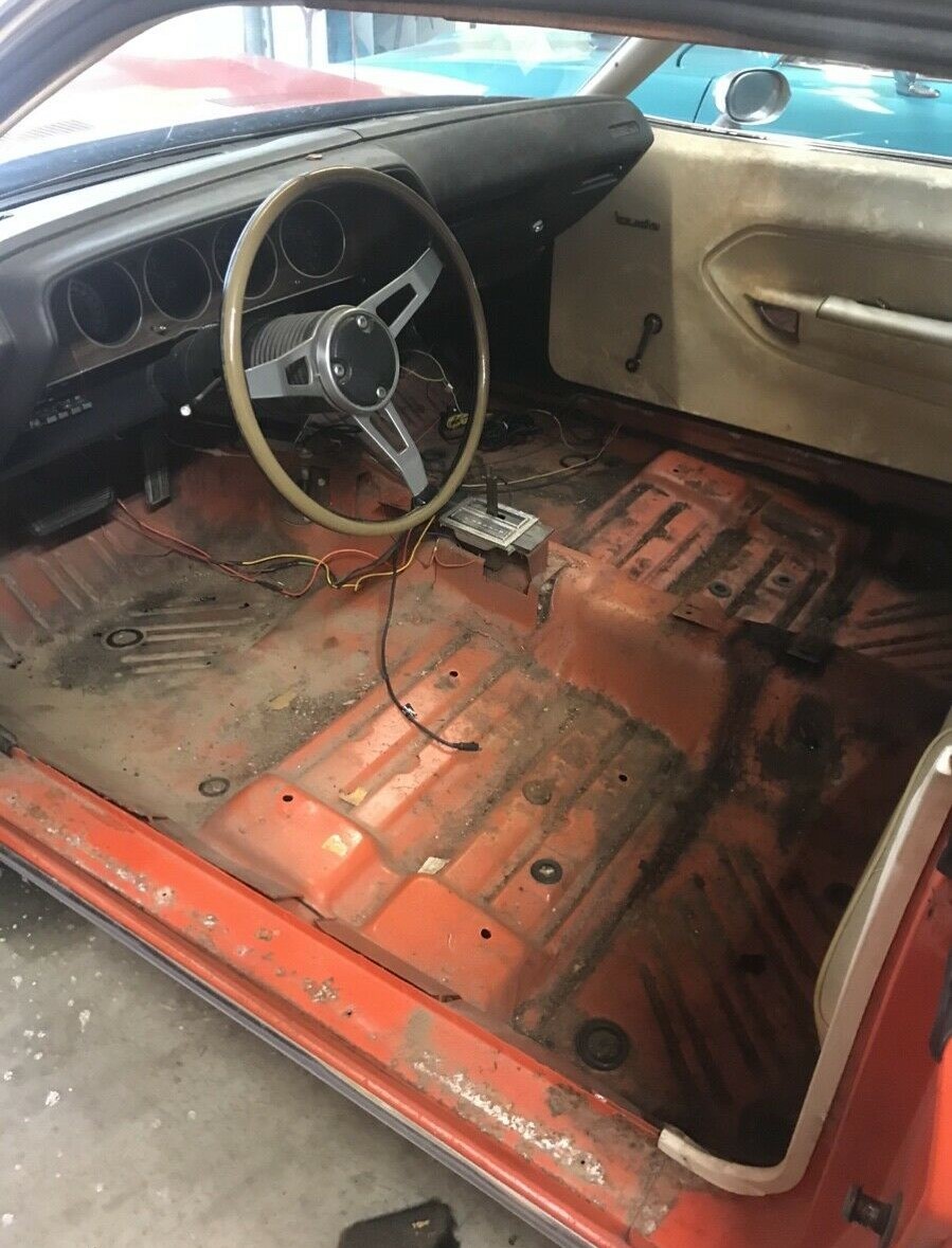 The seller’s 383 ‘Cuda with a TorqueFlite automatic is in somewhat rare territory, as only 1,168 coupes were built that way, making it the second most popular ‘Cuda hardtop that year. Verified by the car’s cowl tag, this Plymouth was painted in Tor-Red, code EV2 (it was known as Hemi Orange at Dodge, which is probably a more accurate name). The seller has owned this car for about four years and used it primarily for weekend outings (Cars & Coffee perhaps?). While it has more than 91,000 miles on the odometer, we’re told the car runs really well and has no reported mechanical issues. Rather than wearing Rallye wheels like so many of these cars did, this one has regular steel wheels with no caps and painted to match the body of the car.