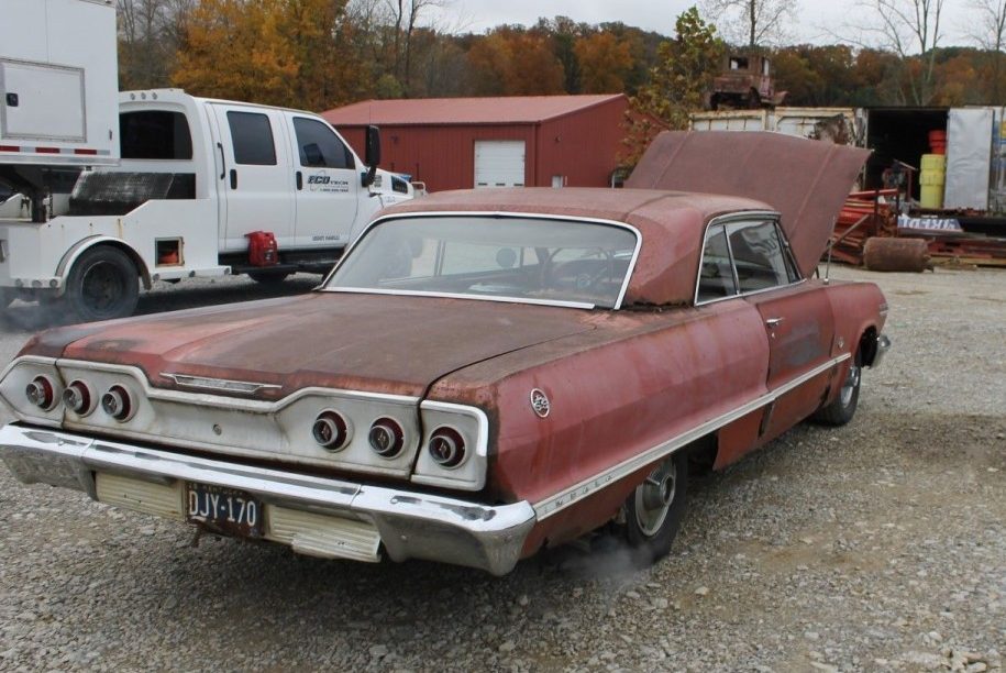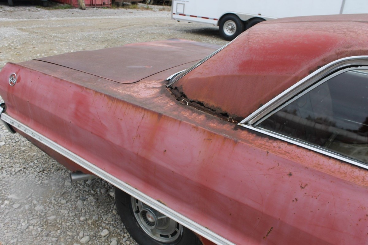 If I’m not mistaken, the roof on these Impala hardtops was pressed to look like a convertible. With contrasting paint I’ve been fooled more than once from a distance. Also, I swear I’ve seem more than one 1963-64 Impala hardtop with a factory VINYL roof. That may explain the awful rust where the top meets the rear fenders. Either way, a wallowy full size performance car that needs to be really inspected on a lift before further restoration.