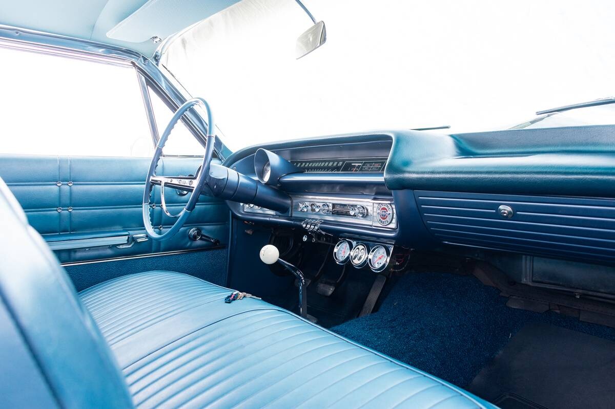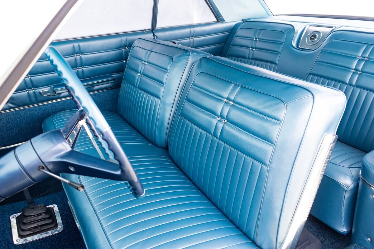 Talk about blue bowtie heaven, this Impala has been treated to a new blue interior and it is simply stunning. Chevrolet described their Impala interiors as “rich, roomy, and fashionably finished.” Amen to that. I really like how the attractive upholstery pattern is continued onto the door panels. I also like cars of the era with rear seat speaker grilles.