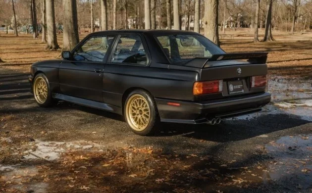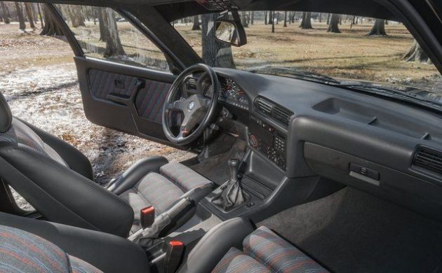 The seller, none other than a Lamborghini dealer in New Jersey, notes that the M3 was refashioned by a local Porsche restoration shop known as Gaswerks Garage. This included taking the original “Lachs Silver” paint down to bare metal and refinished with a satin black finish – an interesting choice. While the modifications appear to be well-executed, the paint job leaves me a bit cold – especially given a respray in the original color would likely have helped restore significant value. The flared bodywork, unique to the M3, is one of the trademark features of an E30 M3, and the flat paint job almost seems to obfuscate those lines.