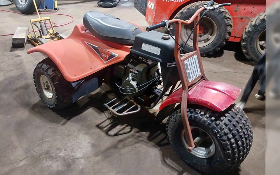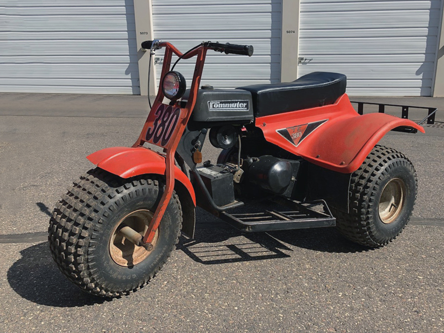 Commuter Industries out of Cascade, Iowa, apparently came along after Pacesetter Enterprises, which made really cool mini bikes and also similar three-wheelers and even five-wheelers, as did Commuter Industries, but nobody really knows the exact timeline of when these things were made, unfortunately. The TE-380 (T = transaxle, E = electric start, 3 = 3 wheels, 80 = 80 horsepower. Just kidding, it’s a one-cylinder 8-hp Kohler engine with electric start going through a Comet-40 clutch to the rear wheels. The enclosed transaxle was fairly innovative at the time and helped to keep mud, dirt, and water out of the drive system. There was a TR-380 with a recoil pull-start and a TE-390 with a 9-hp industrial Kawasaki engine and reverse. Reverse would be handy on this 300-pound thing to back it into the storage unit rather than having to drag the back end around every time. Have any of you heard of Commuter Industries’ three-wheelers? How would you restore the cracked fiberglass rear shroud?