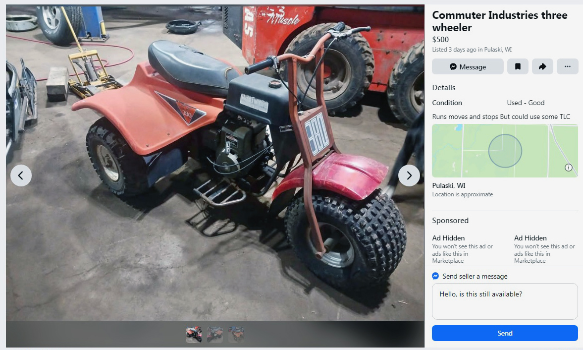 Believe it or not, I’m not a big ATV guy. I’ve never had a real one, or at least what most of us think of when we think of three-wheeled ATVs: Honda, Yamaha, Kawasaki, Suzuki, or others in the sporting category of three-wheelers. As in, just something to have fun riding around on. This 1970s Commuter Industries TE-380 three-wheeler can be found here on Facebook Marketplace in Pulaski, Wisconsin, and the seller is asking $500. Here is the original listing, and thanks to Lothar… of the Hill People for the tip!