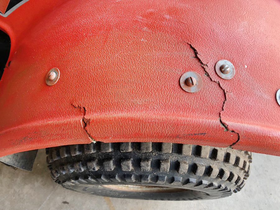 The gas tank is unique in that it’s a metal tank with a plastic cover. I’m not sure why the company went that route rather than just using a metal or plastic tank. The seat has seen better days, but that’s an easy fix. The biggest issue with these heavy-duty machines is the one-piece rear body shell/cover. Mine has a couple of big cracks in it that the previous owner repaired, or tried to repair, and some of the edges are chipped or frayed. For the life of me, I have no clue how to fix that. It’s a textured finish, and it would look weird if it were a smooth patch. I’m sure a lot of you have experience with fiberglass repair and maybe making a mold of that, and then pressing it into the curing fiberglass?