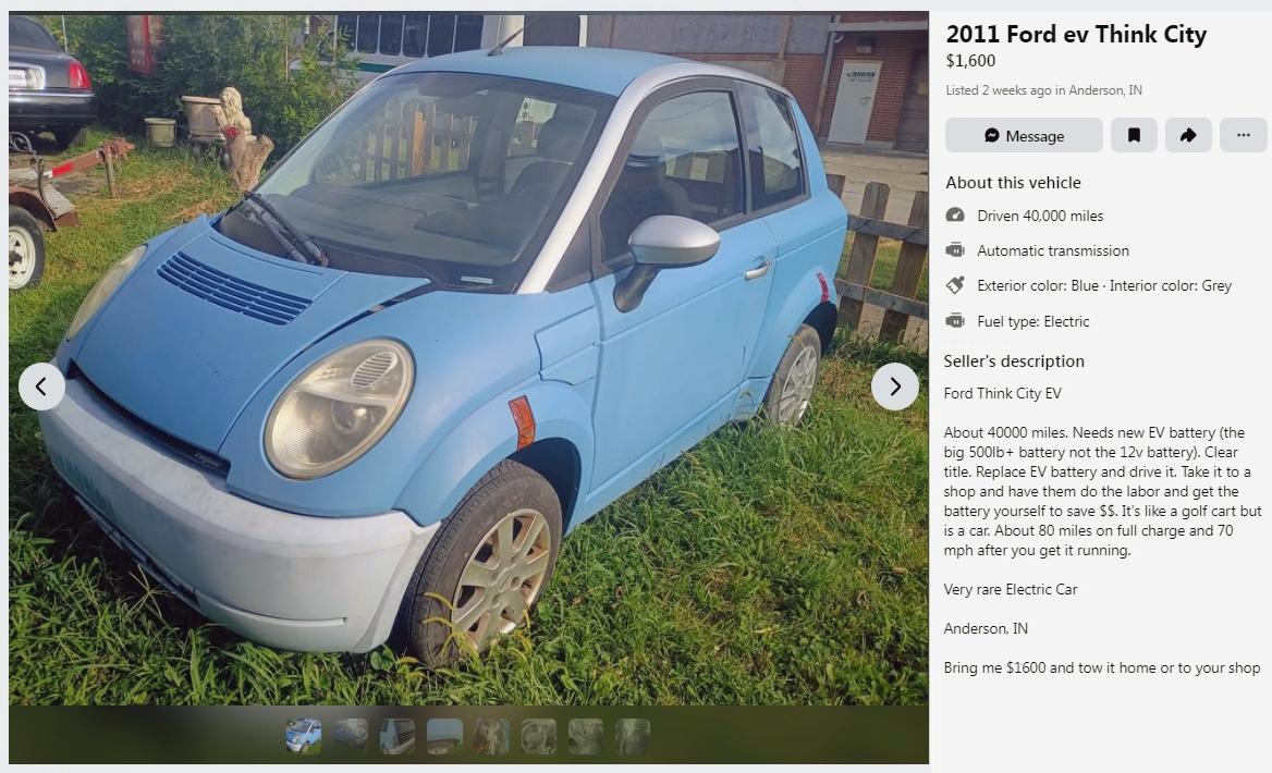 2011 seems so incredibly long ago now, doesn’t it? It’s hard to believe that it has been 15 years since we only had a $14-trillion national debt (compared to $38-trillion today), Andy Rooney retired from 60 Minutes, and CNET named 2011 as the year of the electric car. This 2011 Think City EV can be found here on Facebook Marketplace in Anderson, Indiana, and they’re asking $1,600. Here is the original listing, and thanks to Zappenduster for the tip!