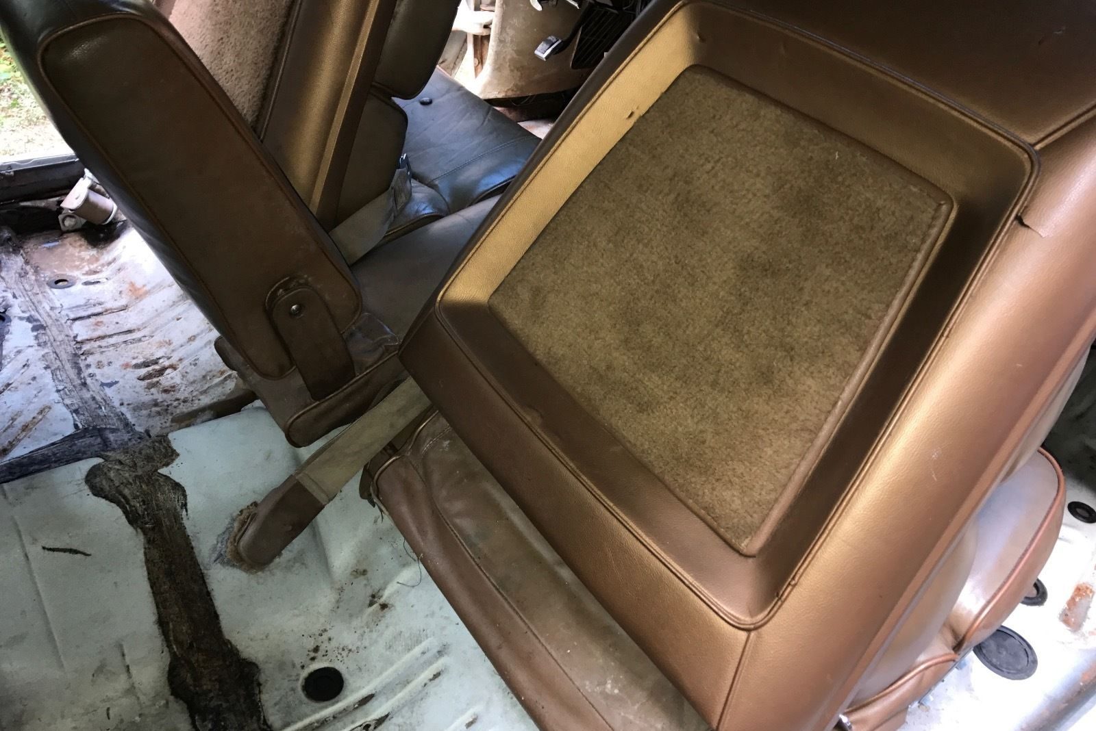 One of the trademarks of a Hurst Chrysler 300 was the gold and white color scheme, because of course it was a Hurst edition. It is hard to tell in the pictures because of the faded paint, but the exterior was white with gold stripes on the hood, sides, and trunk lid. The interiors were largely Hurst gold, and although much of it has been removed, the seller states he has all of the parts that he himself removed. It looks here that the seats may be in good condition, though its hard to tell. The intent of this photo is to show the fantastic condition of the floorpans on this car, and as can be seen in other exterior photos, this car needs almost no sheet metal repair to be ready for paint and reassembly. This appears to truly be a rust-free car!