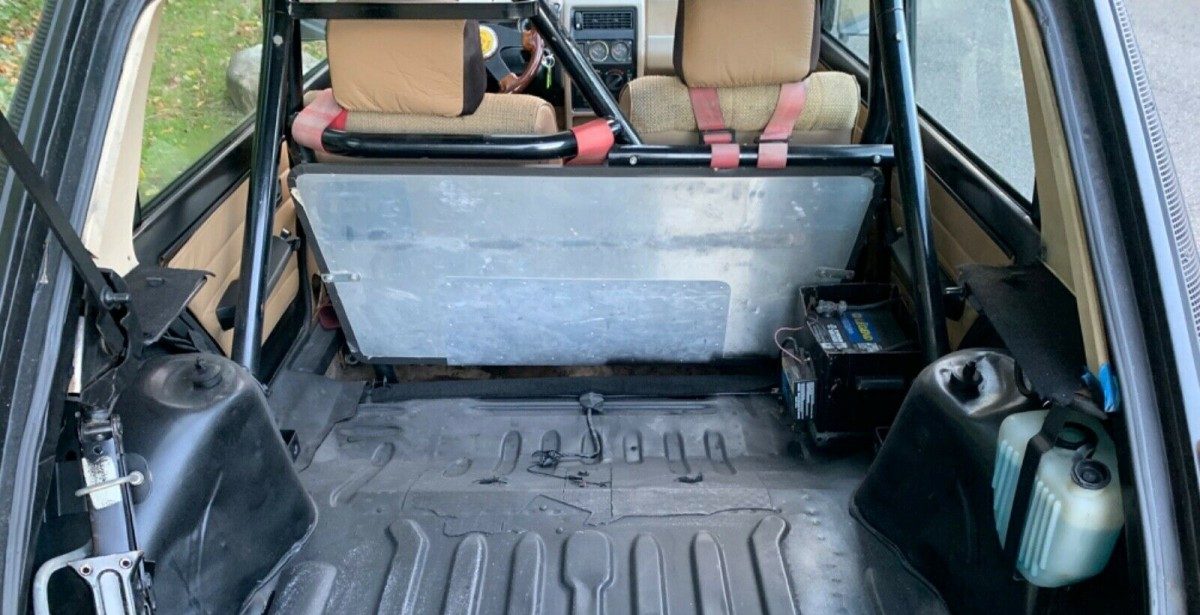 The interior has been gutted and fitted with harnesses and a full cage. The Renault sports a short shifter and aftermarket steering wheel, but also has a canvas sunroof and upgraded stereo – two features you don’t associate with dedicated track cars. The work done to make it safe in competitive driving events is to be commended, but I don’t see other logical upgrades like a fuel cell or fire suppression system. It’s a mixed bag for sure, and I’d love to know more about the inspiration behind this project. The bodywork looks to be in good shape, and aside from the missing seats and trim, the interior is in good order. Oh, and did we mention it’s a four door?