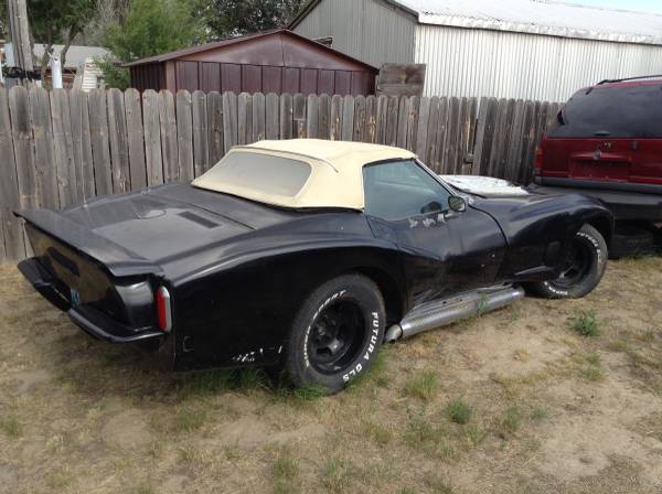 Eckler’s Can-Am body kit on a convertible. Shame they chose a ’72 to do it on, but perhaps at that point in time the bumper cars were just another Vette. Take off the tacky rear lights, open up the original taillights and vent the fender flares. Drop in a crate motor and manual and you might have something.. so long as the frame isn’t too rusted out from sitting. Too much on the asking price though for a non-runner.