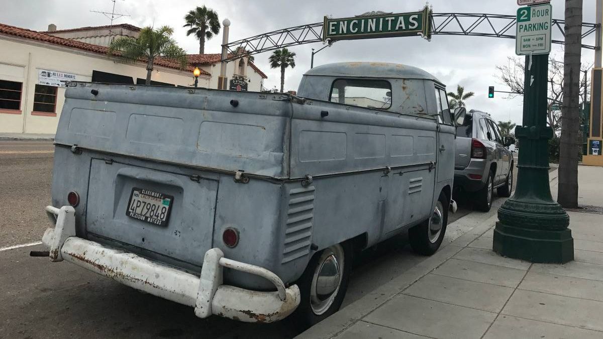 This pickup is said to have been stationary in a garage for a decade or more, but it is now running (with a rebuilt carburetor and a fresh gas tank, and on new tires), and the seller welcomes test drives. Hey, it made it to Encinitas, about a half-hour’s drive—at least in something with only 36 horsepower—from Escondido, for that first photo up there!