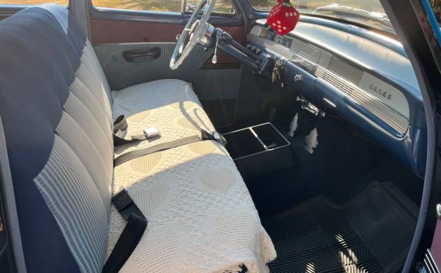 The interior’s condition matches that of the exterior, except for the bedspread/dining room table linen that’s covering the front seat.ย Is it protecting the seat or hiding a problem? An inquiry will have to be made. Beyond that, the upholstery is a blue and white striped fabric material with matching (sorta – the upper part of the panel is covered in a pale red material) door cards. The listing mentions, “New headliner, new flooring (carpet or actual floors?), seats in perfect condition.” The instrument panel is small and simple with legible gauges, but of classic design for the era. Small details such as the weatherstripping and windlace present perfectly. Nice to see is the inclusion of seatbelts.