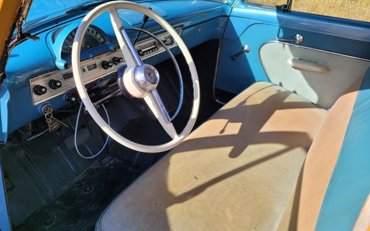The two-tone interior pretty much reflects the exterior’s notable condition. There is some obvious discoloration with the weave upholstery and it appears as if the mat for the toe board area of the front floor is absent, but beyond that, no complaints. The instrument panel is surprisingly clean with bright and clear gauges and no noted missing switch gear. This is a nine-passenger wagon and an image of the rear cargo area would be helpful but unfortunately, none is included. You can always tell a Ford of this era by its left of the steering column ignition switch.